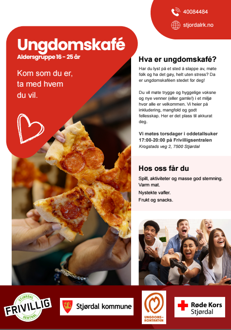 Her kan du være deg selv og treffe nye mennesker. Ungdomskafeen er et samarbeid mellom Røde Kors, Frivilligsentralen og Stjørdal kommune. Det blir servert mat.