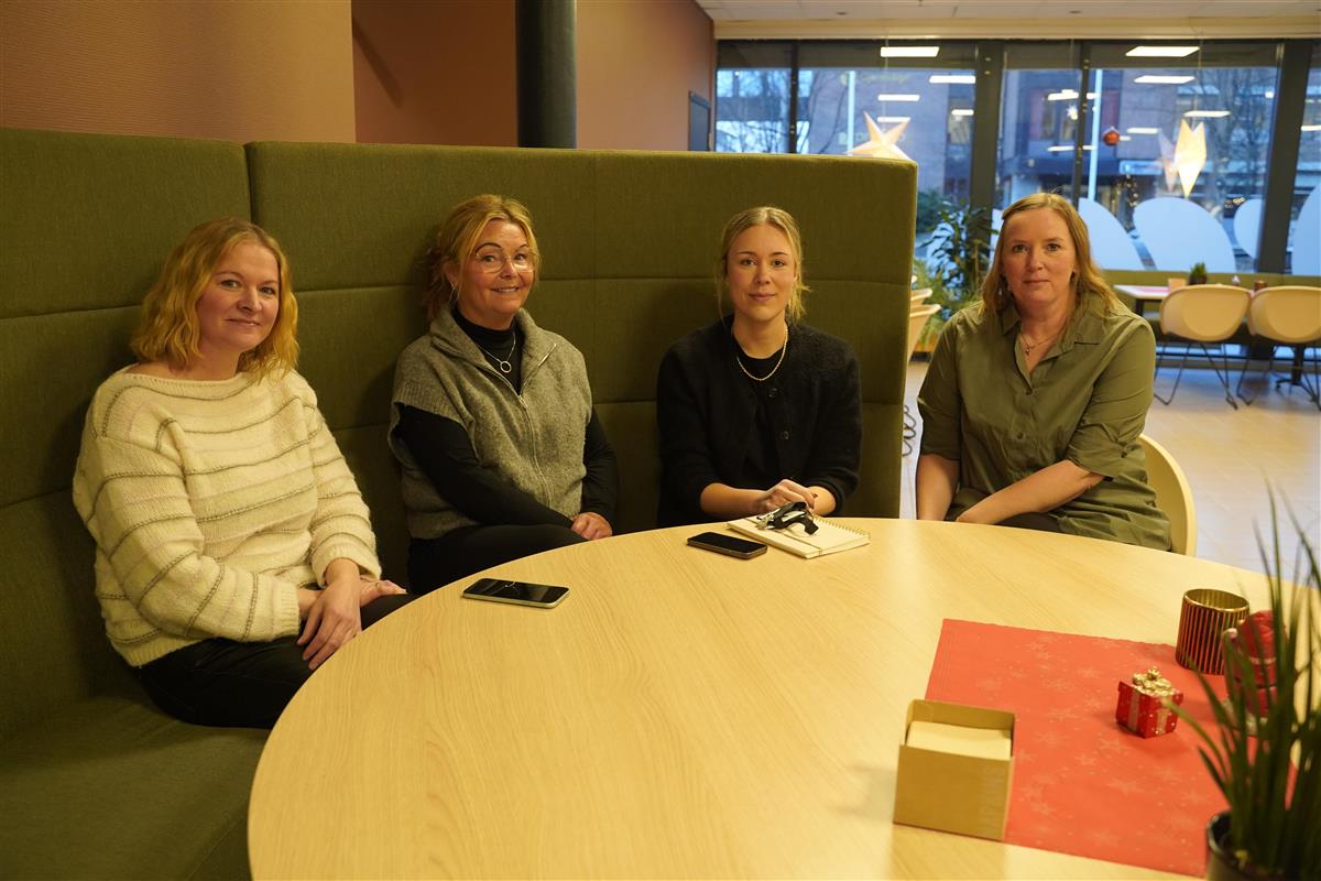 Fra venstre: Torhild Johanne Skjelstad - sykepleier i velferdsteknologi, Lena C. Steig Eggen - Hovedtillitsvalgt Norsk Sykepleierforbund, June Thomsen Stræte - Fagkoordinator i Hjemmetjenesten Halsen sone, og Mona Anette Stoum - enhetsleder Hjemmetjenesten Skatval sone/prosjektleder Digital hjemmesykepleie.Digital hjemmesykepleie er et tilbud til deg som har behov for hjemmesykepleie, men som ikke nødvendigvis trenger at noen møter opp fysisk hos deg hver gang. I stedet får du oppfølging gjennom skjerm – enkelt, trygt og tilpasset dine behov.