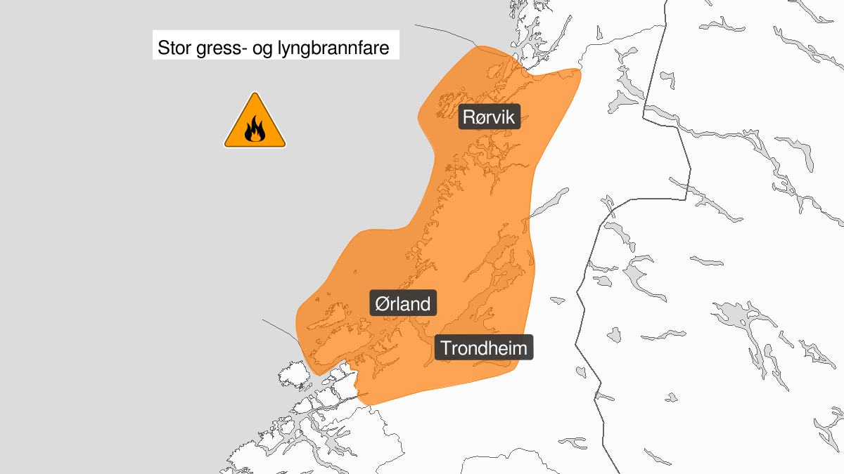 Stor skogbrannfareLytt til tekstenStopp avspillingVarsel fra Meteorologisk Institutt om stor skogbrannfare, oransje nivå for deler av Trøndelag.Det er lokalt stor skogbrannfare i snøfrie områder inntil det kommer nedbør av betydning. Vegetasjonen kan svært lett antennes og veldig store områder kan bli berørt. Råd om å ikke bruke åpen ild.Varsel fra Meteorologisk Institutt for Deler av Trøndelag (Varsom.no)Kart over stor skogbrannfare, oransje nivå, deler av Trøndelag. www.varsom.no Sist endret 16.04.2026 13.21