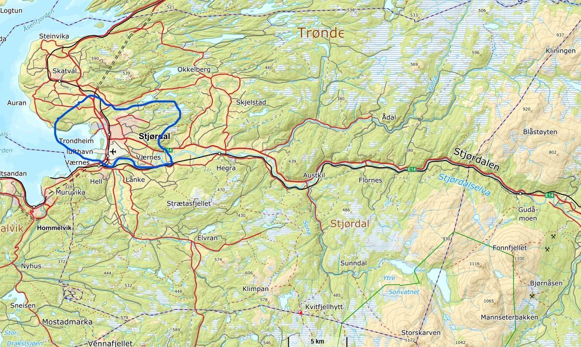 Nedenfor er det skravert et område i blått, som definerer “sentrumsområdet” i Stjørdal kommune og resterende blir definert som “utkantområdet”.